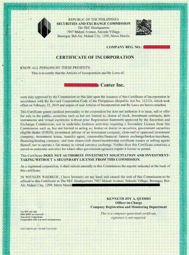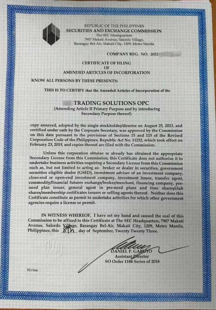 • 向菲律宾 SEC(证券交易委员会) 提交拟定公司名称进行查重。